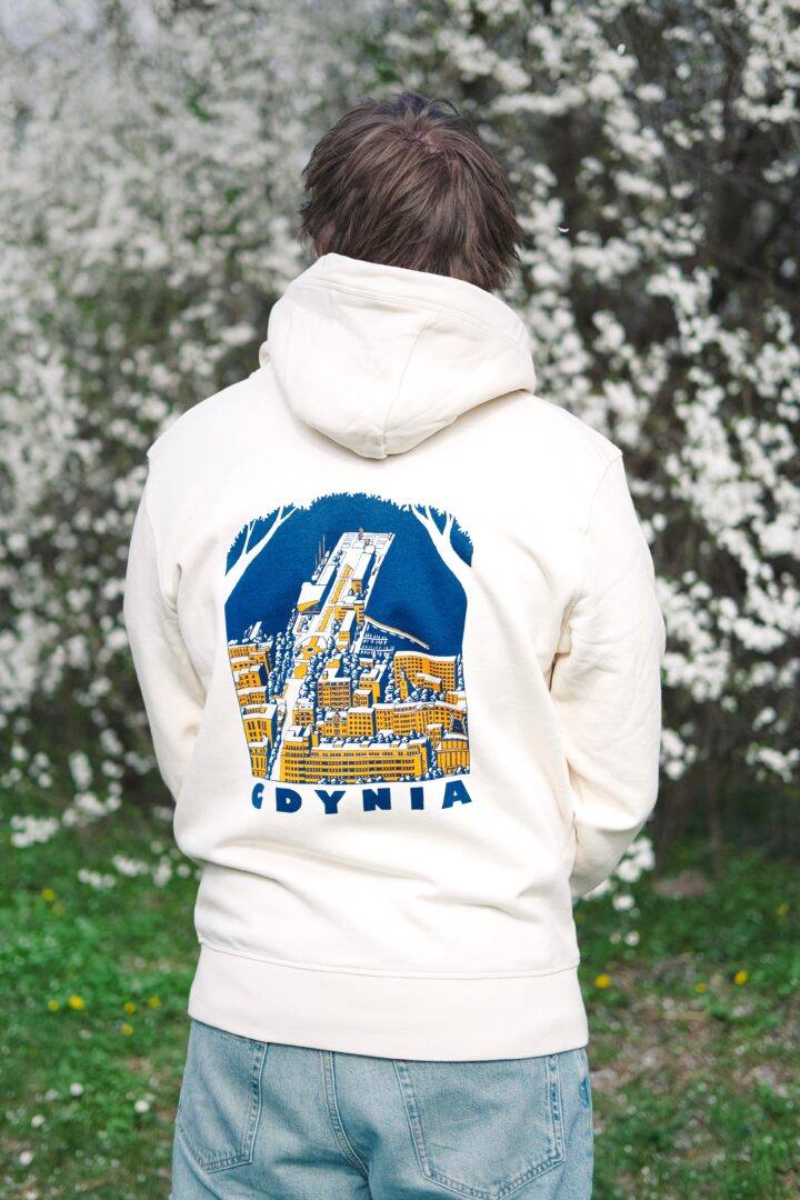 Grafika na lewej piersi to symbole herbu Gdyni, a na plecach panorama Skweru Kościuszki.