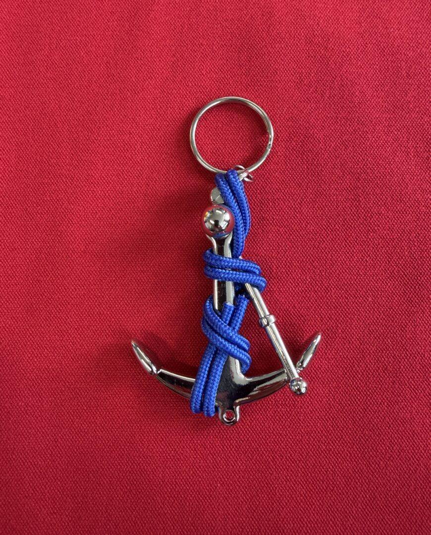 Brelok duża kotwica z niebieskim sznurkiem.