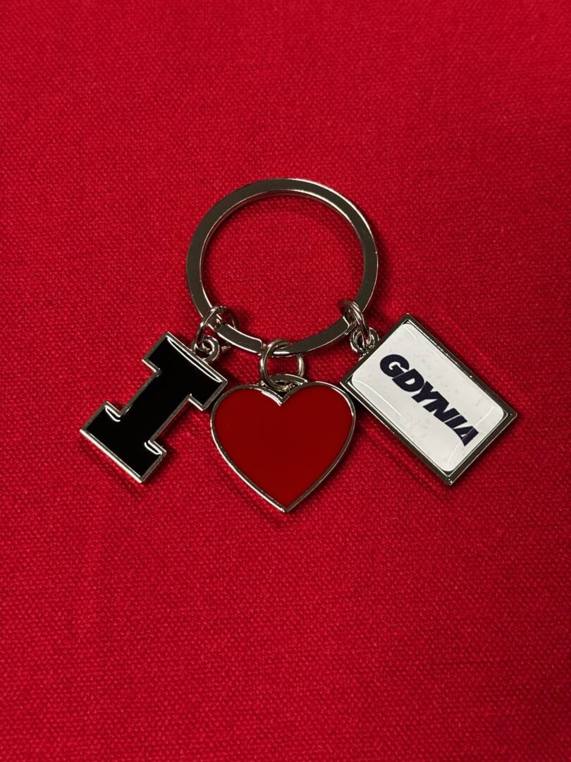 Metalowy brelok składający się z trzech zawieszek: czarnej litery „I”, czerwonego serduszka oraz białej tabliczki z napisem „Gdynia”. Razem tworzą popularny motyw „I ♥ Gdynia”.