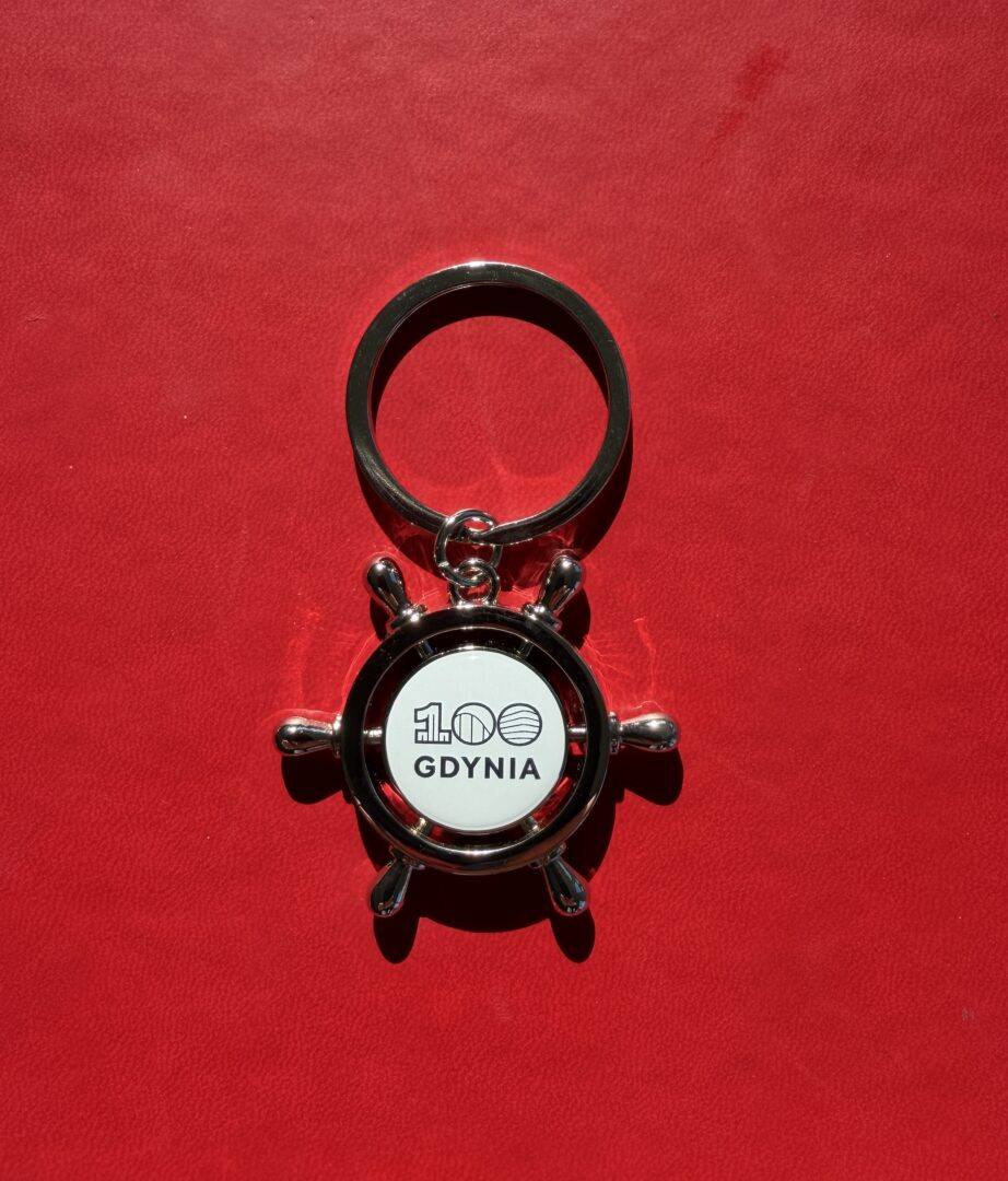 Brelok w kształcie koła sterowego z jubileuszowym Logo 100-lecia Gdyni może przydać się na co dzień.