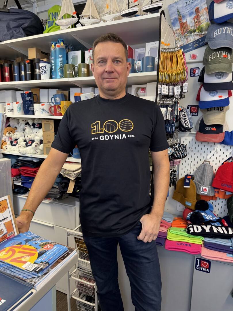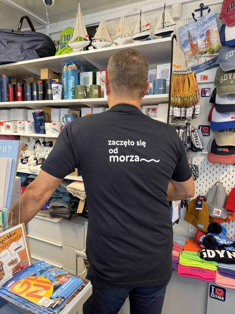 Nadruk z przodu: Gdynia 100, nadruk z tyłu: “zaczęło sie od morza”