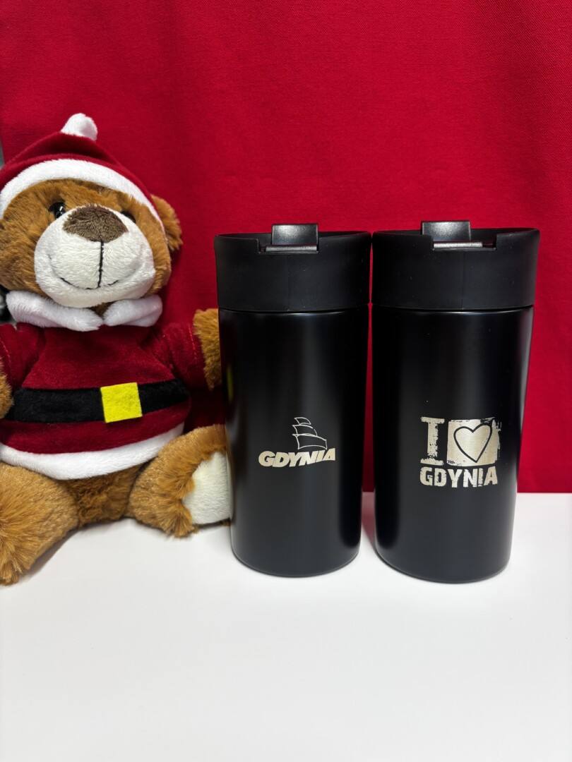 Elegancki i praktyczny kubek termiczny w metalicznym czarnym kolorze, ozdobiony grawerem „I ❤️ Gdynia” lub grawerem z logo naszego miasta. Idealny jako pamiątka z Gdyni lub stylowy kubek do codziennego użytku.