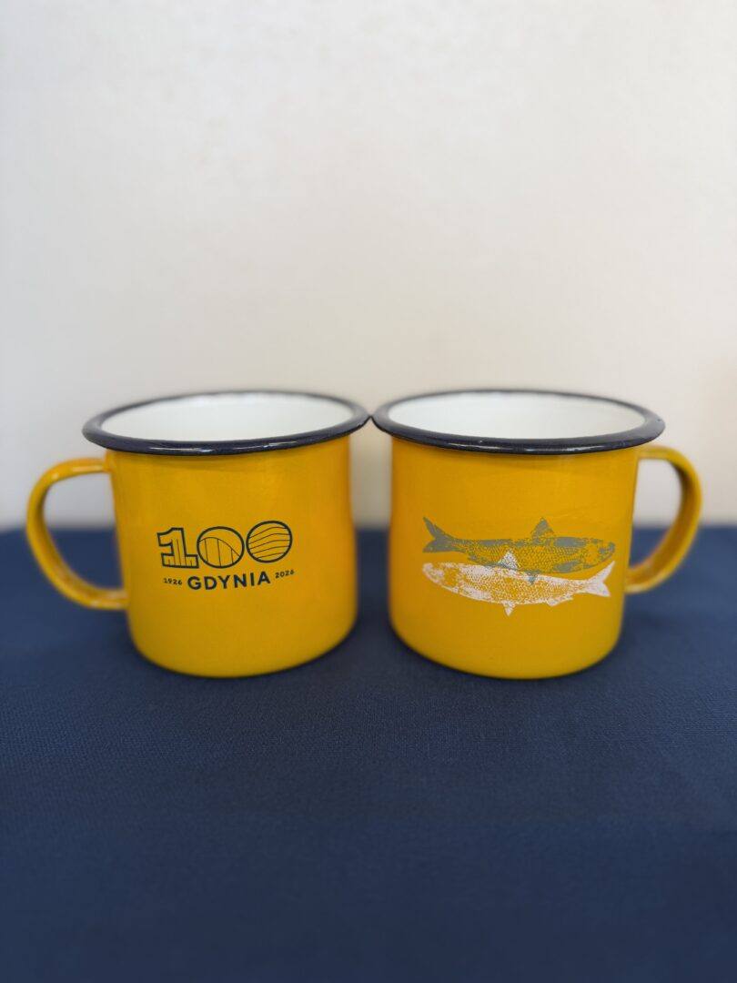 Kubek emaliowany żółty z obustronnym nadrukiem, z jednej Logo 100-lecia Gdyni, z drugiej dwa śledzie, bardzo gdyńska ryba.