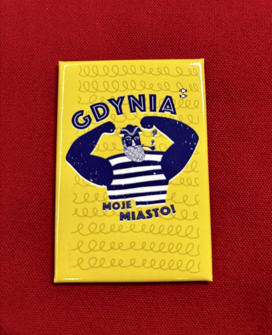 Kolorowy magnes przedstawiający stylizowaną postać marynarza w granatowo-białej koszulce w paski, dumnie prezentującego muskuły. Grafika utrzymana jest w morskiej, humorystycznej stylistyce. Na żółtym tle widnieje napis „GDYNIA – MOJE MIASTO!”, podkreślający związek z nadmorskim charakterem miasta.