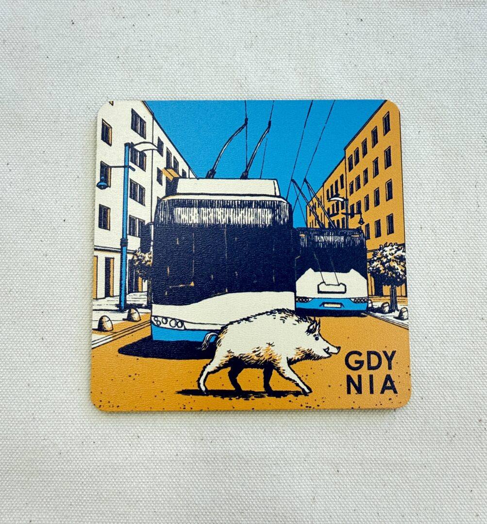 Podkładka pod kubek Gdynia dzik i trolejbusy – grafika autorstwa Jana Rutki