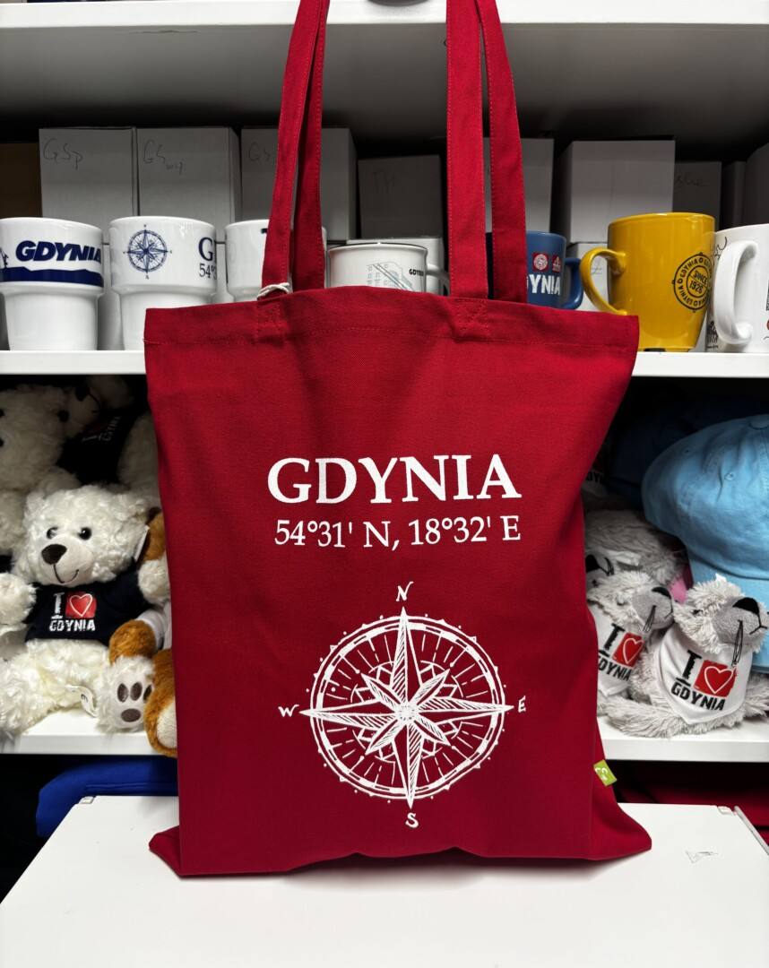 Torba bawełniana “Gdynia Róża Wiatrów” (grubość tkaniny 340 g) w kolorze czerwonym z białym nadrukiem.