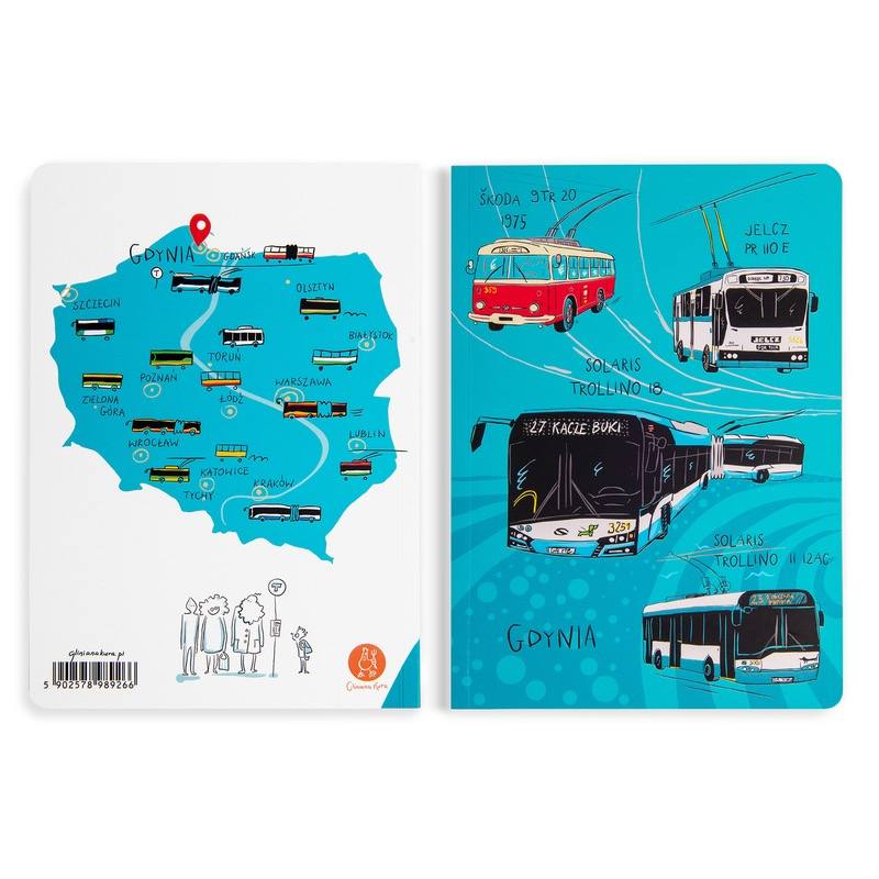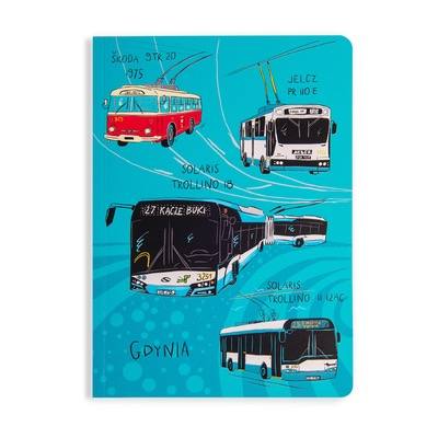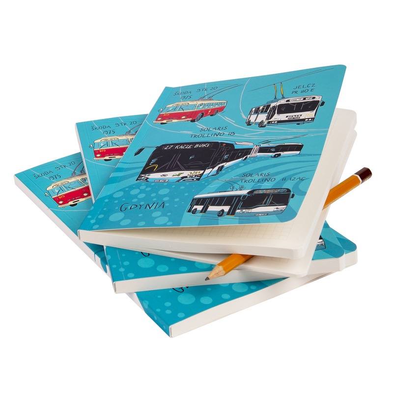Zeszyt formatu A5 z ilustrowaną okładką przedstawiającą gdyńskie trolejbusy.